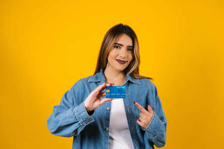 young latin woman holding a credit card for shopping on yellow background in Mexico Latin America