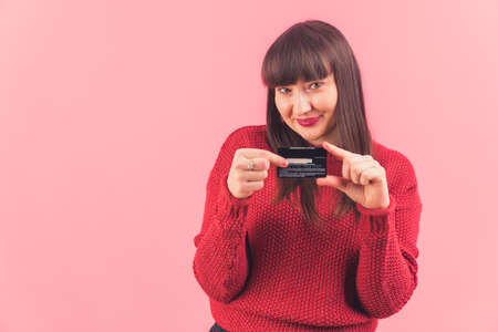 Portrait of smiling caucasian woman holding plastic debit credit card and looking at camera over pink background. Online shopping concept. High quality photo