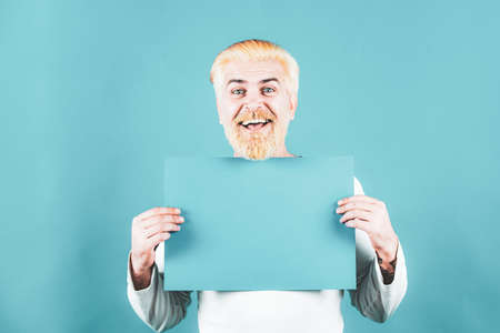 Man holding blank card. Blank, empty paper, billboard with copy space for text.