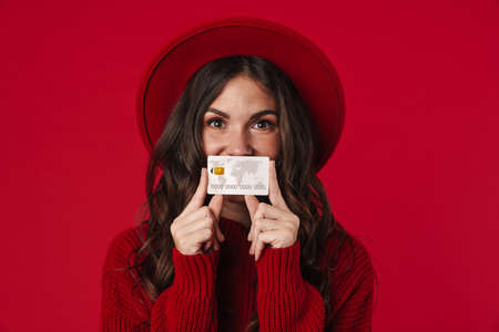 Happy beautiful brunette girl in hat posing with credit card isolated over red background