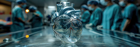 A delicate glass heart is placed on a table before a team of surgeons, surrounded by medical instruments and equipment