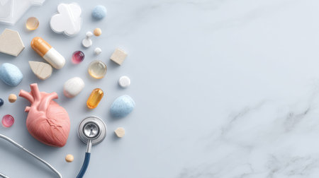Medical background from pharmaceutical tablets and pills, stethoscope and red heart Healthcare and medicine.
