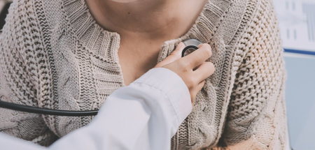 healthy concept; Doctor checking patient's heart with stethoscope at a hospital