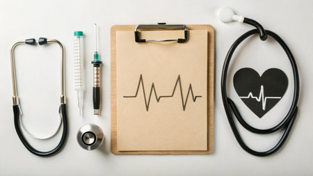 Cardiogram on clipboard with stethoscope and syringe on white background