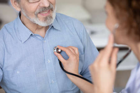 Crop close up of female doctor hold stethoscope listen to mature male patient heartbeat in private clinic. Woman nurse or GP use phonendoscope in hospital check mature man heart rate at consultation.