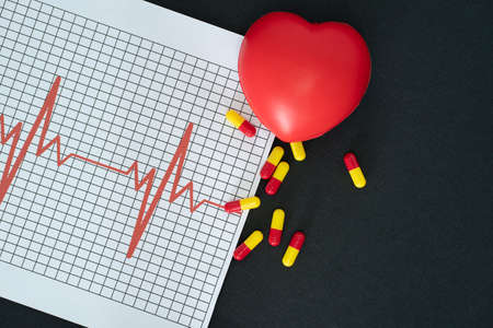 A pile of red pills in a shape of heart on cardiogram. Medical concept.