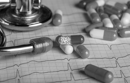 Cardiogram, two red-white capsules and stethoscope to listen to heart