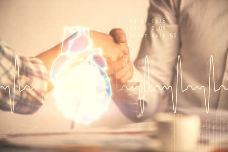 Double exposure of heart hologram and handshake of two men. Medical concept