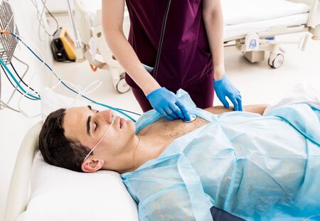 Cardiologist put sensors on patient skin preparing heart cardiogram close up. Unrecognized doctor placing electrodes on bare chest of adult man in hospital room. Sick person lying in clinic ward bed.