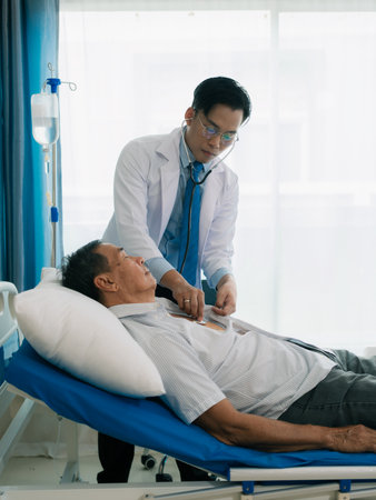 Image of a doctor examining a patient with a stethoscope to listen to the heartbeat of a male patient as a guideline for treatment and preventive care.