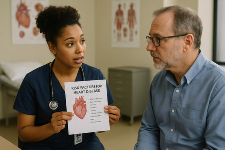 Female doctor showing risk factors for heart disease to senior male patient during medical consultation in hospital room