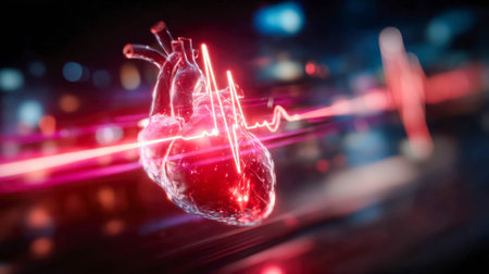 Futuristic glowing human heart with ECG heartbeat line, symbolizing health, cardiology, and modern medical technology.