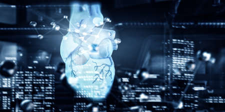 Human heart model,concept of cardiology, health care, human organ transplant. 3D modeling in the field of internal organ transplantation. Technologies in medicine and scientific research of the body, the study of human internal organs