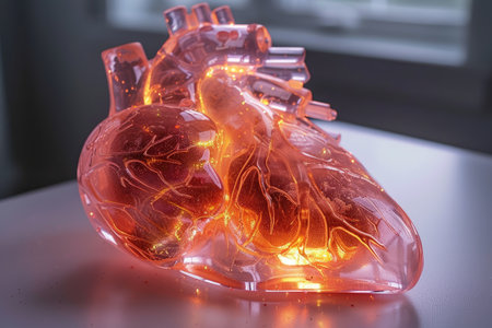 The intricate design of a human heart model features glowing veins and textures against a vibrant background, showcasing its structure and complexity in a laboratory context.
