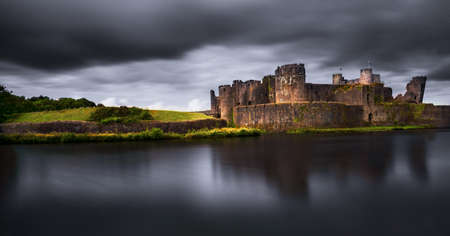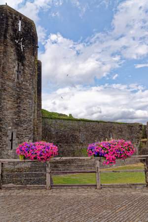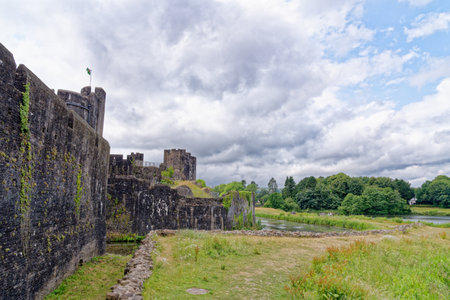 Caerphilly Castle, a partially ruined fortification, dating from the 13th Century. Caerphilly Mid-Glamorgan South Wales, United Kingdom - 25th of June 2023