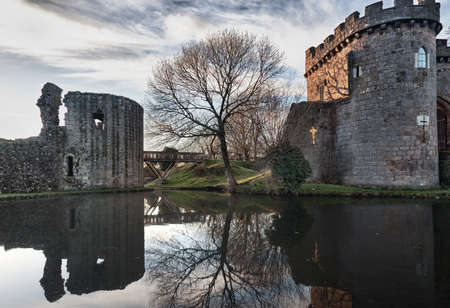 Ancient Whittington Castle in Shropshire, England reflecting in a calm moat round the stone buildings