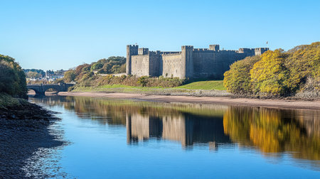 A picturesque view of a historic castle reflected in a serene river, surrounded by autumn trees under a clear blue sky, showcasing natural beauty.