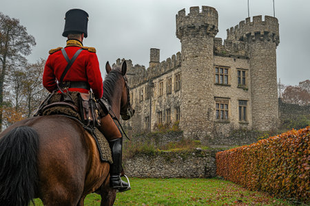 Soldier in uniform riding a horse while guarding a historic castle in the autumn