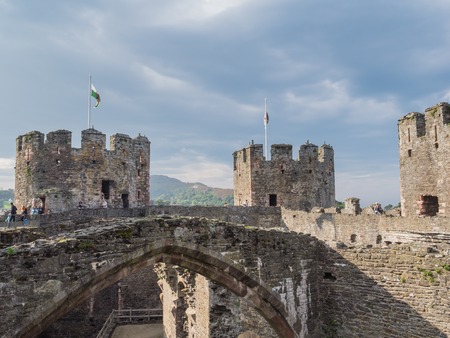 CONWY, WALES - 28 SEPTEMBER 2013: View on the battlements of massive Conwy Castle in Wales built by king Edward I as one of the fortifications during the conquest of Wales in the 13th Century