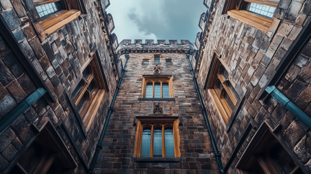 A panoramic view from inside a historic castle courtyard, capturing the architectural symmetry and the cultural essence of its historic significance.
