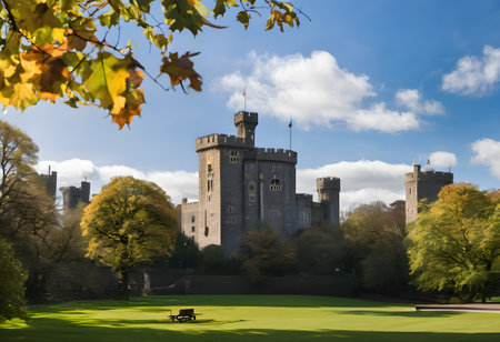 Cardiff, Wales / United Kingdom - Sept. 23, 2011: A landscape view of Cardiff Castle. A medieval castle and Victorian Gothic revival mansion located in the city centre of Cardiff, Wales.