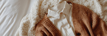 A warm-colored sweater and a button-up shirt are casually placed on a fluffy blanket, creating a comfortable and inviting atmosphere in soft lighting.