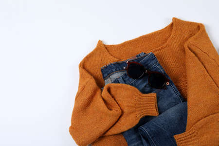 Sweater and white shirt, clothes on gray background with copy space. Clothing donations, conscious, environmentally friendly consupmtion - new trends in shopping. Slow fashion concept. Selective focus