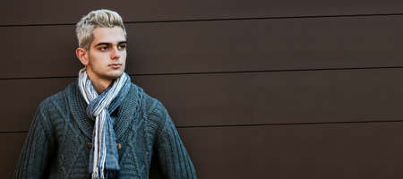 Beautiful lady in spring clothes, wearing a brown coat, standing on the background of a beige wall, looking into the camera. Stylish girl against the background of the wall. Copyspace