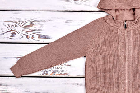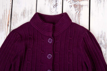 Collar of purple woolen sweater. Pullover with buttons, front view. Bright wooden desk background.