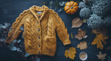 A cup of coffee with latte art sits next to a yellow knitted sweater on a blue wooden table, surrounded by fallen autumn leaves.
