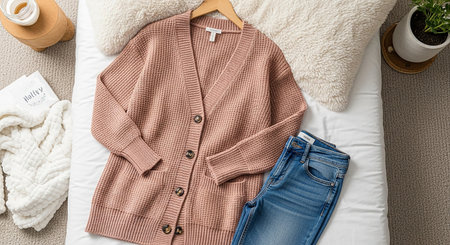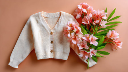 A cozy cream cardigan paired with beautiful pink flowers on a soft peach background, ideal for fashion styling, seasonal trends, and artistic composition.