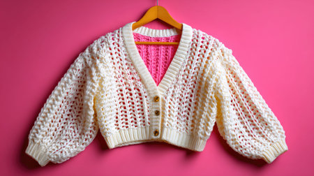 This stunning cropped knit sweater features a delicate design with buttons and a soft texture, perfect for showcasing modern fashion trends against a vibrant pink backdrop.