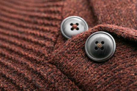 Knitted fabric structure. Gray jacket with black buttons close-up. Front and inner side
