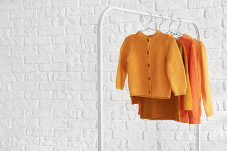 Collection of warm sweaters hanging on rack against graybackground, closeup