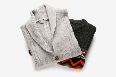 Two knitted sweaters folded in bed top view. Winter season concept.