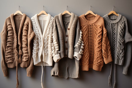 Row of different stylish fashion knitted jackets coat winter clothes for women , warm neutral tones colored