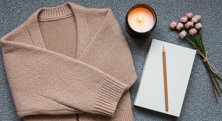 Warm knitted sweater, notebook, candle and flowers on grey background