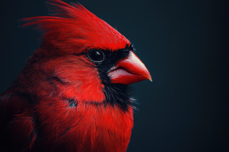The striking red cardinal is perched gracefully with its head slightly turned showcasing its vivid plumage and distinctive black mask around the eyes. Its bright colors contrast beautifully against the dark background emphasizing the birds intricate details and natural beauty