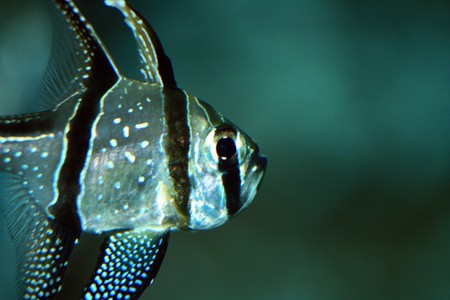 This captivating fish glides effortlessly in deep water, displaying its striking black and white pattern along with delicate fins, while exploring its aquatic habitat.