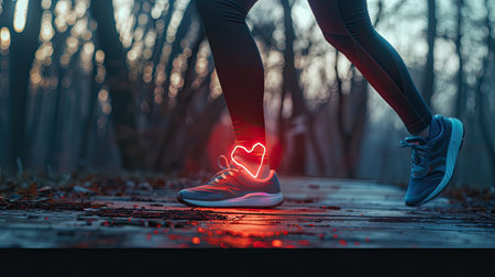 A runner in activewear runs on a damp path as a fitness tracker displays heart rate data nearby.