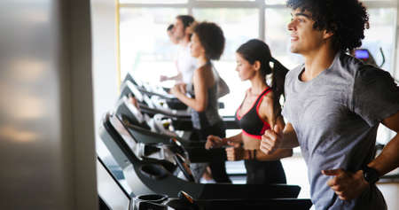 Man running in a gym on a treadmill concept for exercising, fitness and healthy lifestyle.healthy concept