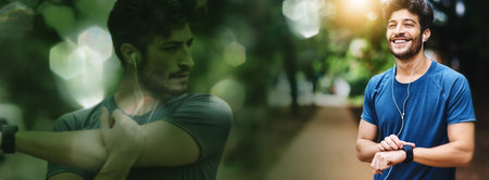 Fitness, banner or happy man with smart watch in nature to monitor workout, exercise or training performance. Mockup space, music or sports runner checking heart rate, health or progress on timer