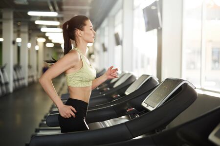 Side view portrait of fit young woman running on treadmill during cardio workout alone in empty gym, copy space