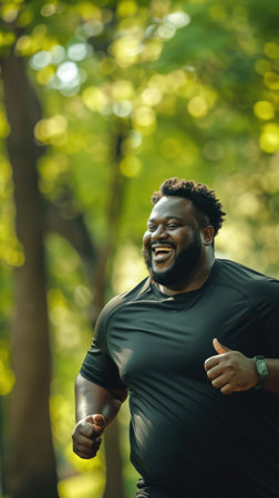 A man is running in a park and smiling. He is wearing a black shirt and a watch
