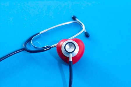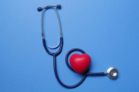 Red heart shape and medical stethoscope on blue background