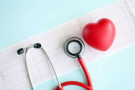 Red toy heart and stethoscope lying on cardiogram closeup