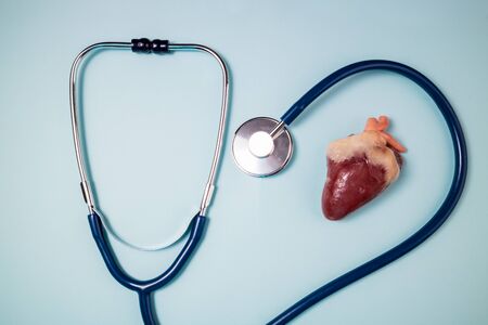 Stethoscope and raw heart on blue background. Medical background. Medicine, medical examination, health care heart protect and cardiology concept. Top view