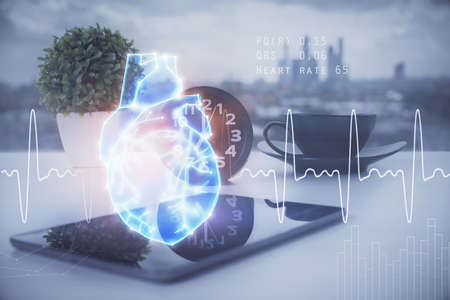 Heart hologram drawings over computer on the desktop background. Top view. Multi exposure. Concept of medical education.