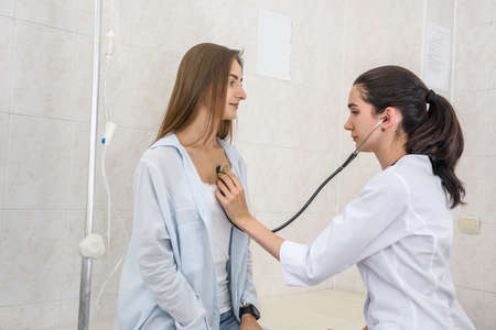 doctor listening to the patient's breathing through the stethoscope, the nurse listens to the heartbeat of the patient, examination of the patient