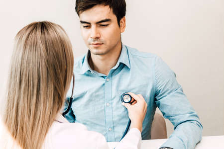 Female doctor examining male patient with stethoscope in the hospital.healthcare and medicine